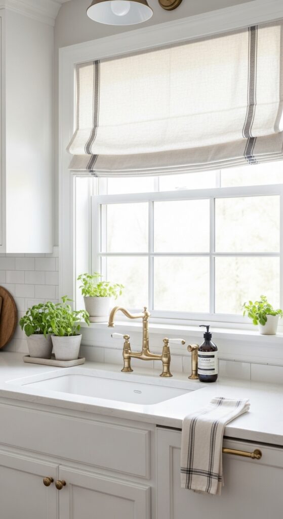 Why it works: Kitchens are filled with hard planes, so one fabric layer matters. A linen Roman shade introduces movement and reduces the stark line between glass, trim, and backsplash without interrupting the clean architecture of a white farmhouse kitchen.