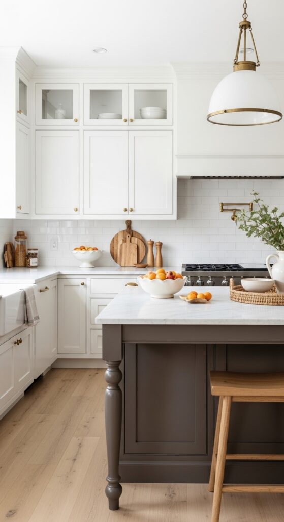 Why it works: A soft mushroom island adds depth without breaking the timelessness that makes white farmhouse kitchens so durable. Because the color is muted and earthy, it anchors the center of the room while keeping the palette calm.
