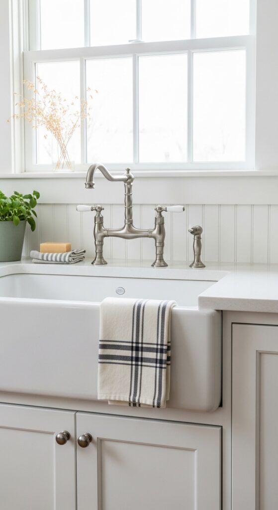 For budget impact, buy three things first: a striped cotton runner under $40, an amber glass soap dispenser around $15, and one stoneware crock or white ironstone pitcher for about $20 to $35. Those pieces add texture fast without forcing a full remodel.