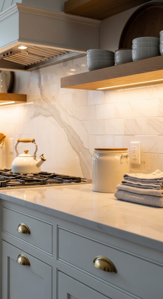 How to get it: Use LED tape in a frosted aluminum channel and keep it between 2700K and 3000K. Hide the strip behind a slim light rail so the glow washes the backsplash instead of exposing the fixture itself.