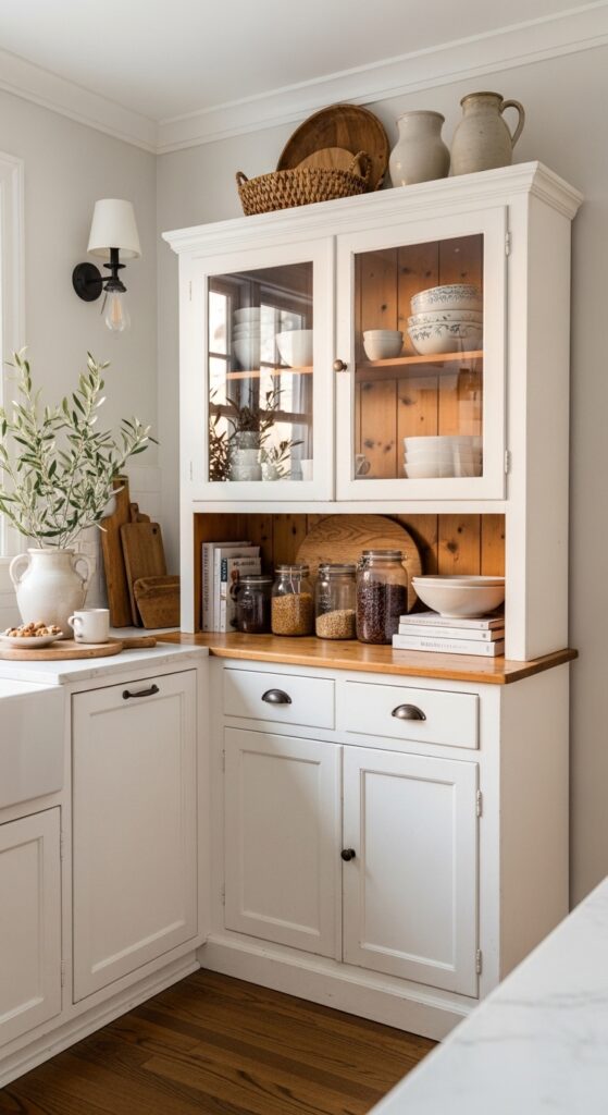 How to get it: Look for a hutch no deeper than 18 to 20 inches if walkway space is tight. Keep the cabinet interior edited—pantry jars below, prettiest bowls and boards above—so the piece feels useful, not crowded.