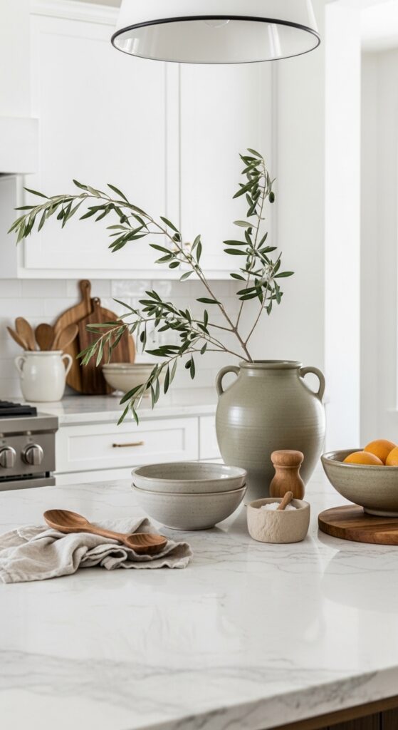 How to get it: Use one tall matte urn, one low bowl, and one practical piece like a salt cellar or wooden board. Keep the arrangement off-center so the island still reads as a workspace first.