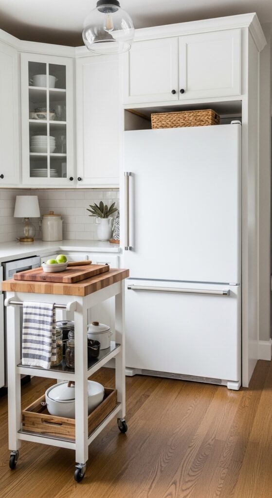 Why it works: Small kitchens benefit from anything that reduces protruding bulk. A cabinet-depth refrigerator keeps the wall line cleaner, and a slim movable cart adds prep space without committing the room to a fixed island that might choke circulation.