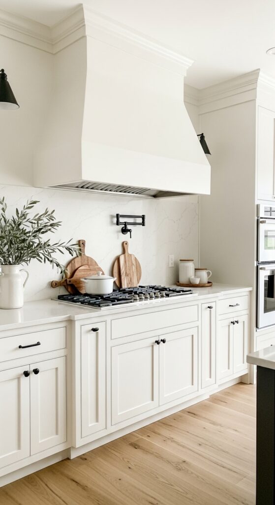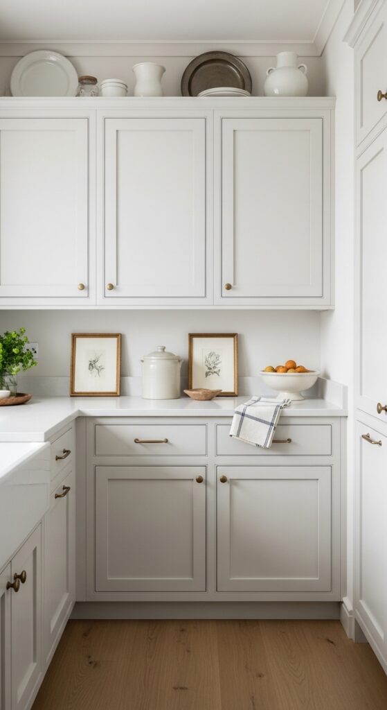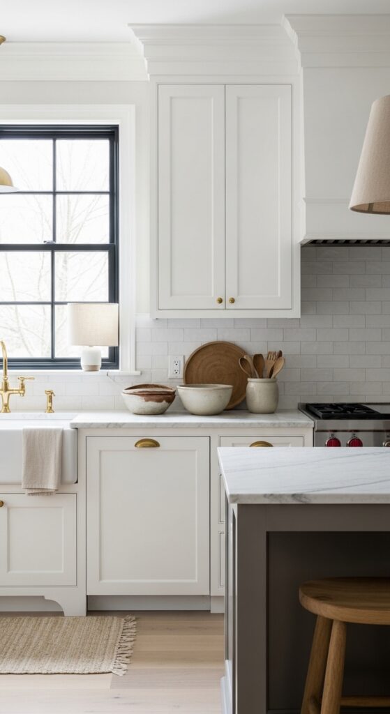 Why it works: White-on-white can flatten if every surface carries the same undertone. Greige walls behind white cabinetry create gentle contrast, allowing cabinet lines, brass, and wood tones to stand out without pushing the room into high drama.