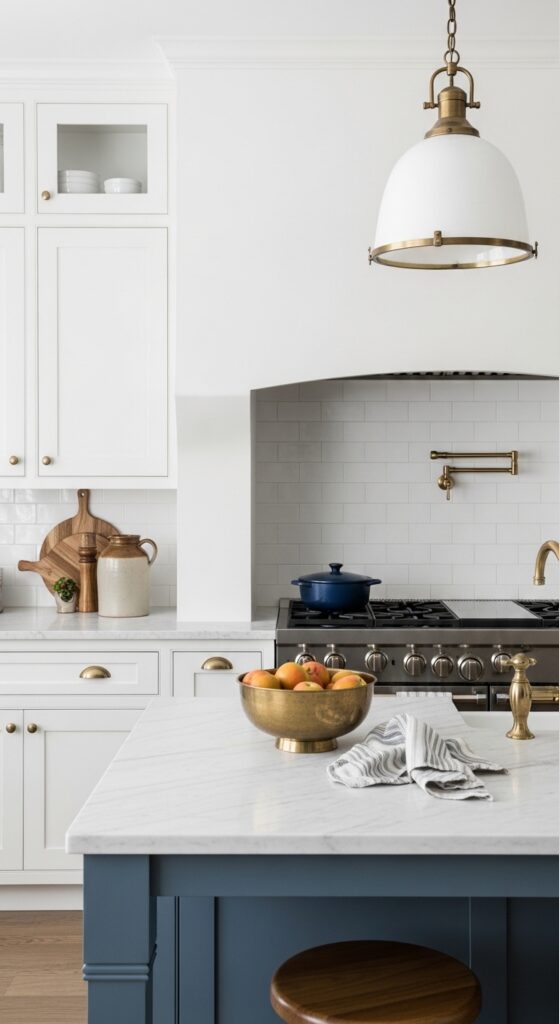 How to get it: Try Sherwin-Williams Smoky Blue or Farrow & Ball Parma Gray on the island base only. This works especially well if your backsplash and perimeter counters stay quiet and mostly tonal.
