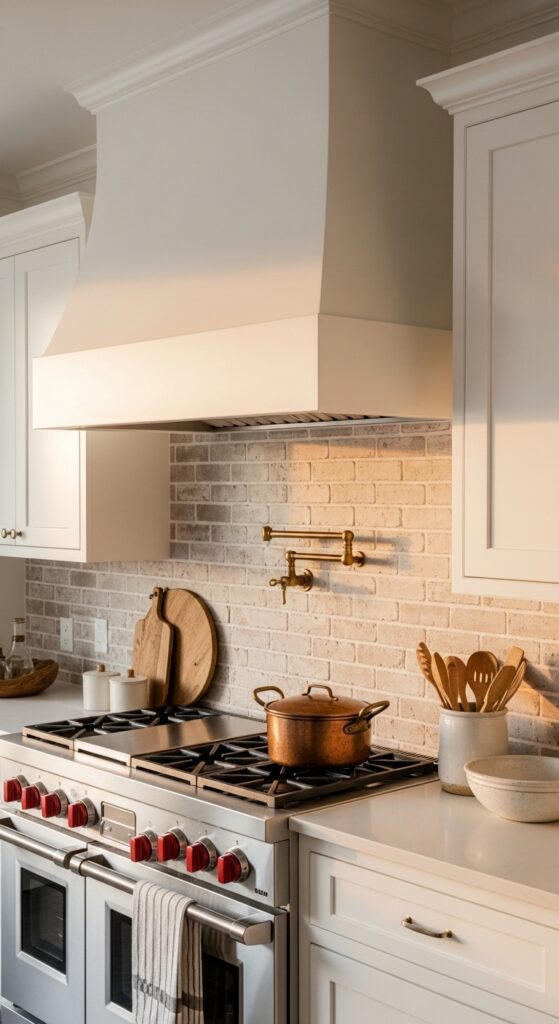 Why it works: Brick introduces rough texture and warm undertones that white cabinetry can bounce off beautifully. It also gives the range wall a stronger sense of permanence, which helps new kitchens feel less new.