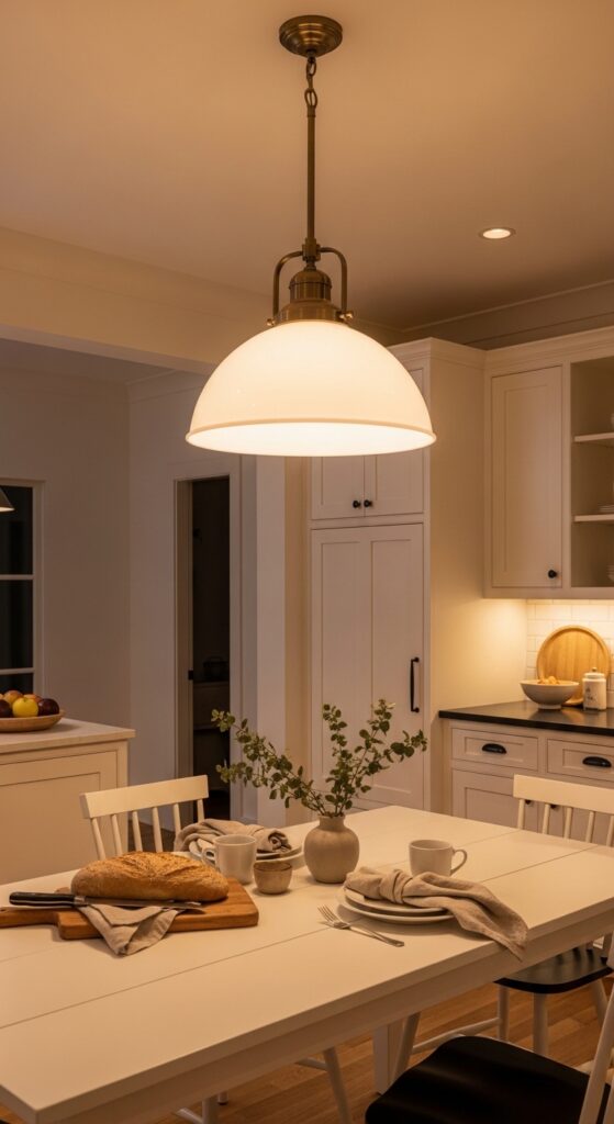How to get it: Center the pendant 30 to 36 inches above the tabletop and choose a shade wide enough to visually anchor the table. Schoolhouse and factory-inspired forms work especially well with shaker cabinetry and wood floors.