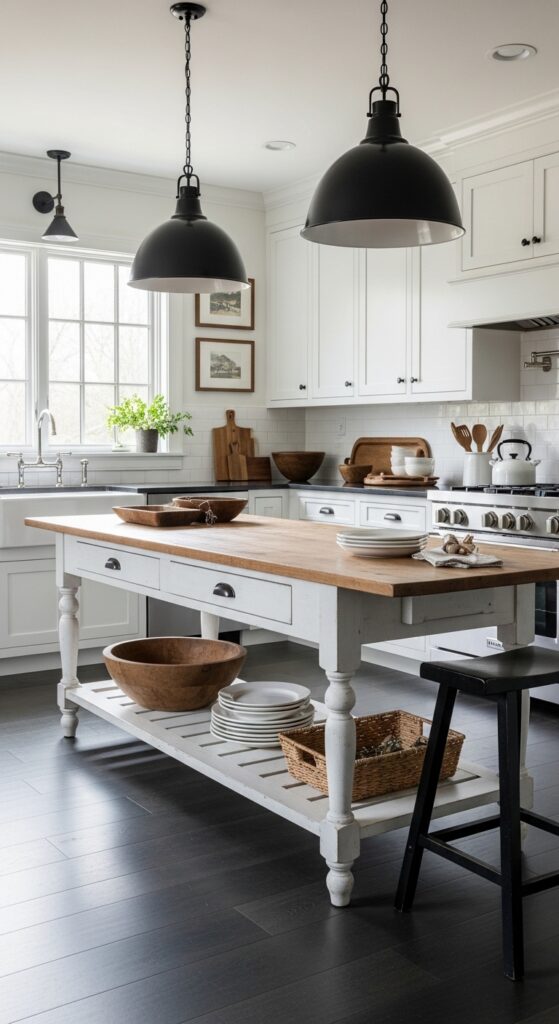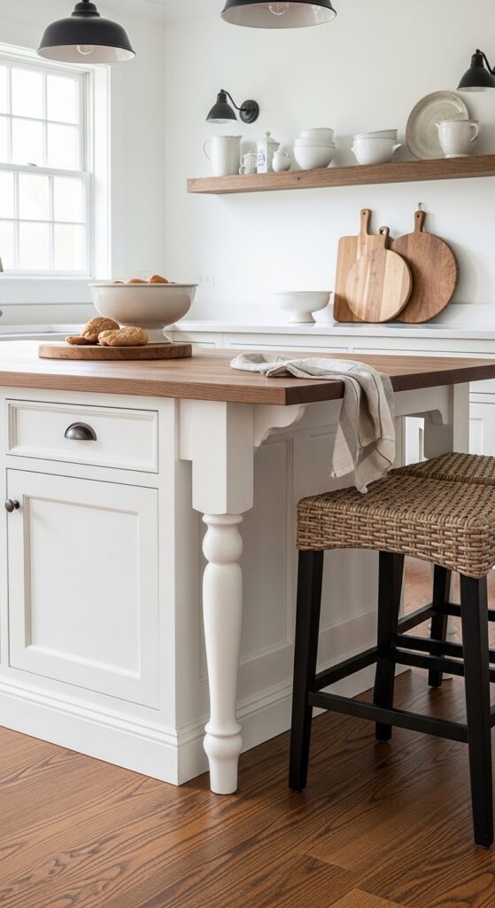 Why it works: A table-island keeps the center of the kitchen visually open because you can see underneath it. That negative space makes the room feel lighter, while the furniture form reinforces the farmhouse idea of a kitchen built around gathering and work.