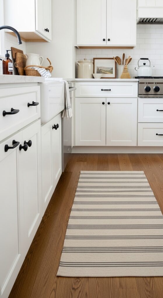 24. White Farmhouse Kitchen Ideas With Black Iron Hardware and a Striped Runner