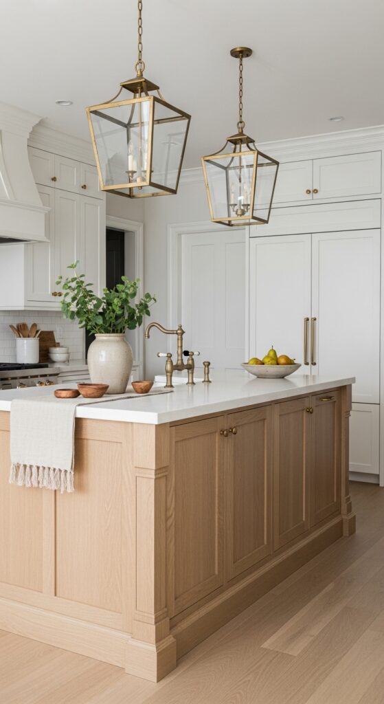How to get it: Try shades like Farrow & Ball Drop Cloth or Benjamin Moore Pashmina for the island only. Keep the countertops light so the darker base reads intentional, not heavy.