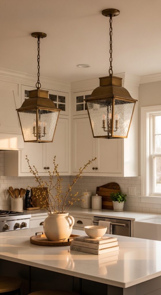Why it works: Pendant lighting sets the kitchen’s rhythm from above. Lantern shapes suit farmhouse architecture because they carry old-house character, while aged brass adds reflective warmth that keeps white cabinetry from feeling too one-note.