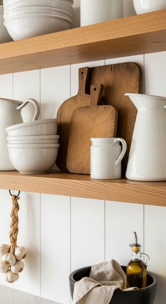 Why it works: Accessories work best here when they double as texture. White ironstone echoes the cabinetry, while worn boards bring in brown undertones and irregular shape, which keeps the shelf from disappearing into an all-white backdrop.