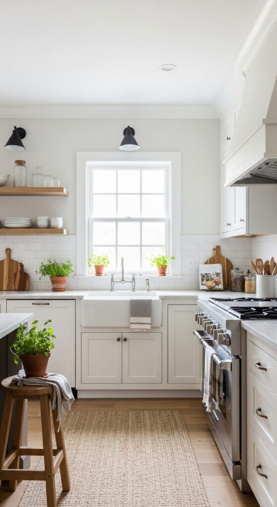 Yes—white farmhouse blends especially well with English country, cottage, industrial, and even Scandinavian influences. The key is keeping the foundation steady: one warm white, one main wood tone, and no more than two metal finishes. A plaster hood can lean rustic, while clean-lined stools can lean Scandinavian, and the room will still feel cohesive if the palette stays quiet.
