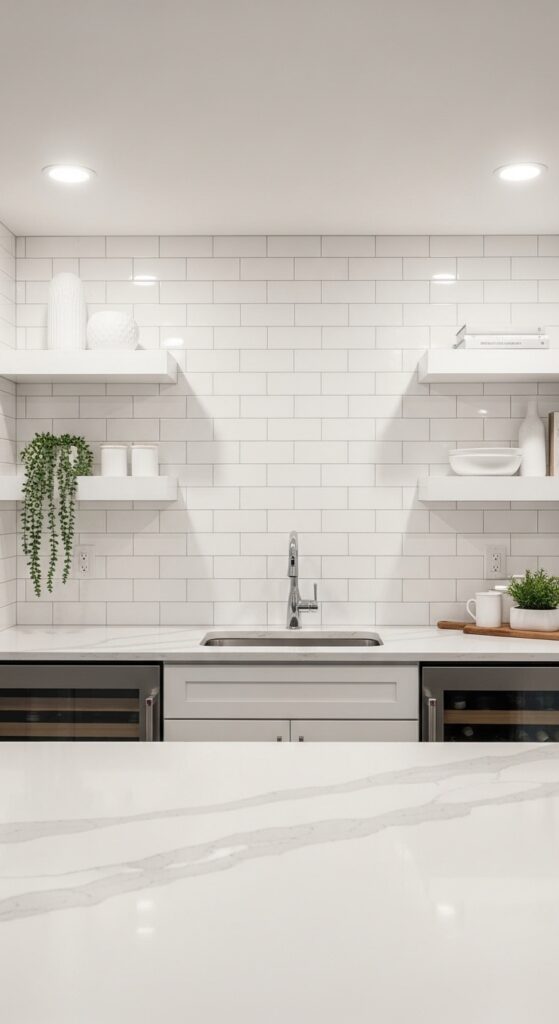 How to achieve it: Choose whites intentionally — Benjamin Moore “White Dove” for cabinets (warm), Cambria Quartz “Torquay” for counters (cool white), and white subway tile in a classic 3×6 offset pattern. The mix of warm and cool whites in the same family creates sophistication without any color.
