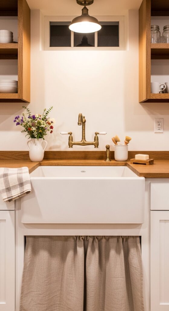 💡 A tension-rod with a linen panel below an open-base farmhouse sink costs under $25 and is infinitely easier than building cabinet doors.