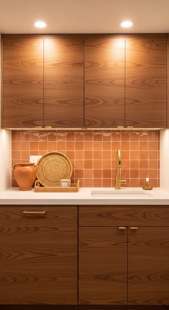 12. Warm Walnut Cabinetry with Terracotta Accents