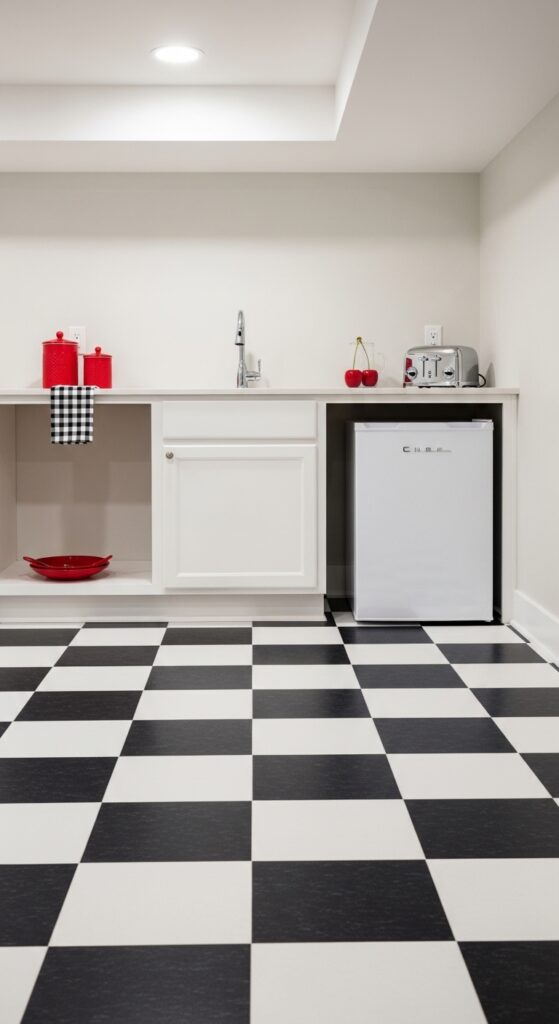 13. Black-and-White Checkered Floor Tile Kitchenette