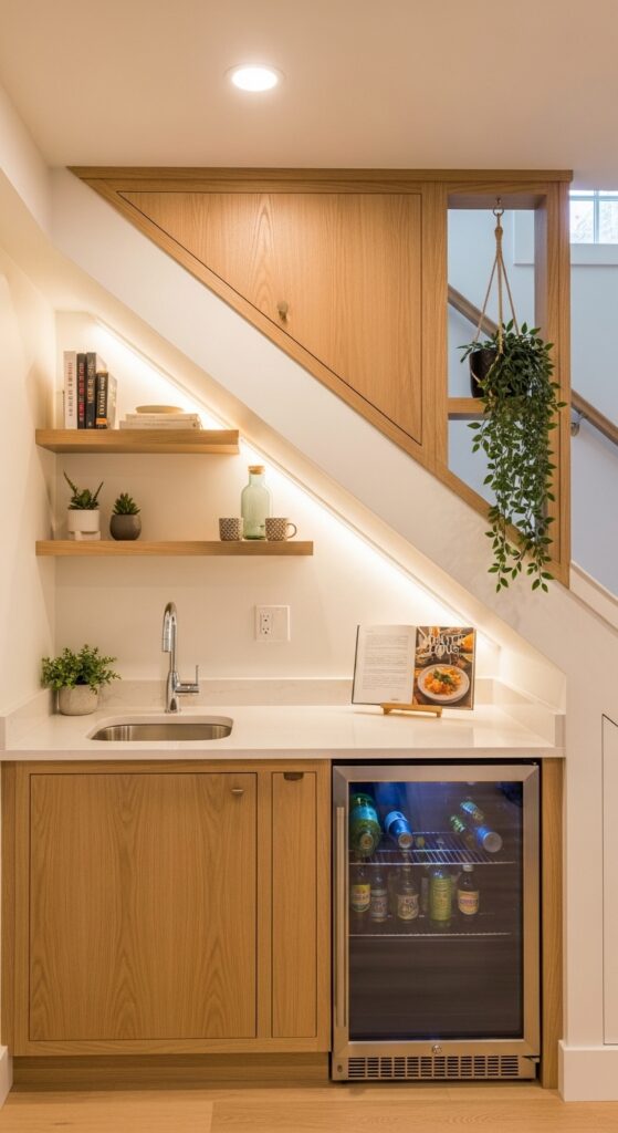 Vibe sentence: The under-stair kitchenette is a design move that turns a structural inevitability into the cleverest feature in the basement.