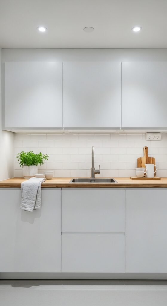 15. Scandi-Minimalist White and Light Wood Kitchenette