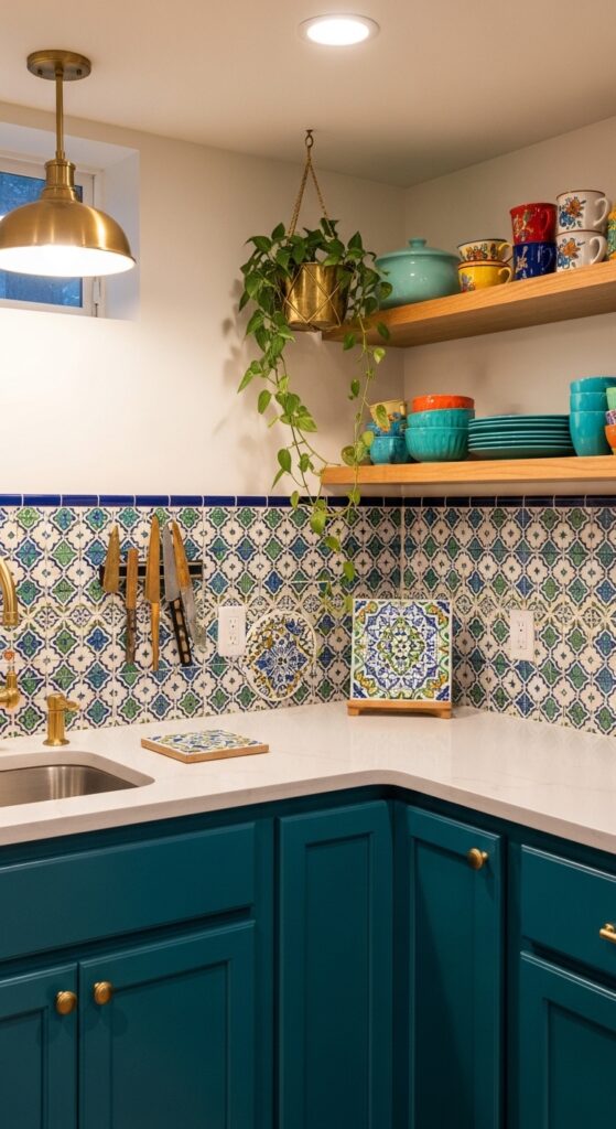 How to achieve it: Moroccan cement tiles or Spanish-style porcelain pattern tiles are available from Wayfair, Overstock, or Etsy shops starting at $5–$12 per square foot. Restrict pattern tile to the backsplash only — repeating it on the floor creates visual overload in a small space.