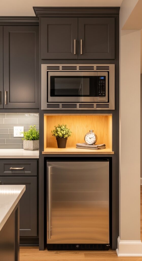 How to achieve it: Measure your microwave and mini fridge precisely before designing the column. Build the surrounding cabinet box from MDF or plywood and finish to match existing cabinetry. Trim panels (available from cabinet manufacturers or cut from matching finish board) bridge any gaps cleanly.