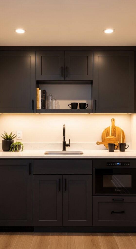 How to achieve it: Choose flat-front Shaker or slab cabinet doors in a deep charcoal like Benjamin Moore’s “Wrought Iron” or Sherwin-Williams “Caviar.” Pair with a simple white quartz counter and install under-cabinet LED strip lighting to keep the space from reading as cave-like.