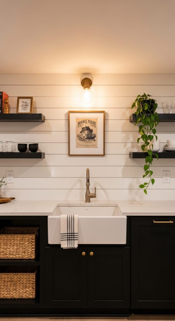 What makes it work: The horizontal lines of shiplap draw the eye along the wall, creating a sense of width that’s particularly flattering in narrow basement kitchenette spaces. Painting it in warm white and contrasting with matte black cabinetry creates a modern farmhouse palette that feels current without being trendy.