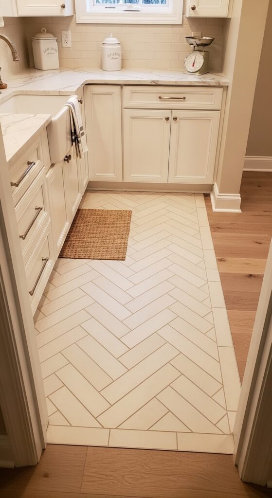 What makes it work: The herringbone pattern’s zigzag geometry draws the eye through the space rather than across it, creating an optical lengthening effect. In a cream-on-cream colorway with a light grout, the pattern reads as sophisticated texture rather than bold statement — adding interest without competing with other elements.