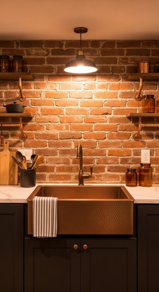 What makes it work: Brick’s inherent warmth, texture, and depth make it a perfect anchor for a kitchenette aesthetic that leans rustic or industrial. Copper is the ideal metallic companion — its warm reddish tone rhymes visually with the brick’s red and orange undertones rather than fighting them.