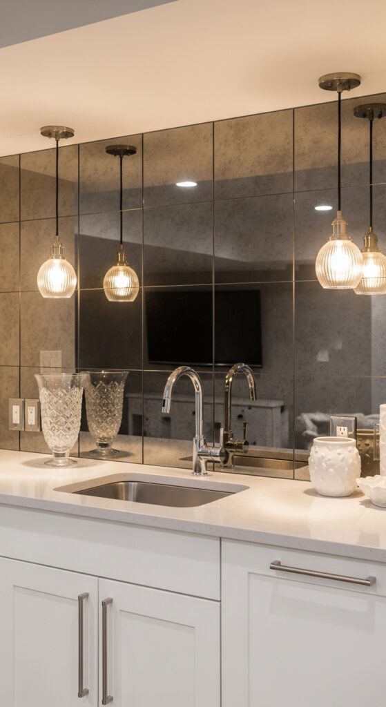 Vibe sentence: In a basement where natural light is scarce, a mirrored backsplash doesn’t just solve a problem — it turns the limitation into a glamorous design feature.