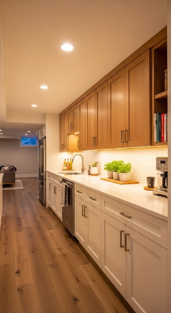 How to achieve it: Plan the galley kitchenette along the longest unobstructed wall in the basement. Allow a minimum 42-inch clearance in front of the counter for comfortable use. Under-cabinet LED lighting is critical in a one-wall layout — the counter is against the wall, making overhead lighting alone insufficient.