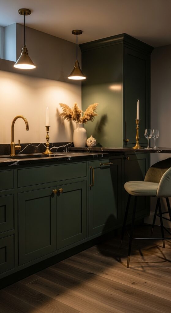 What makes it work: Deep jewel tones like forest green read as luxurious rather than dark when paired with warm brass and honed marble — the combination is rich without being heavy. Lacquered cabinet finishes reflect light in a way that matte finishes don’t, keeping the deep green from absorbing too much of the basement’s limited illumination.