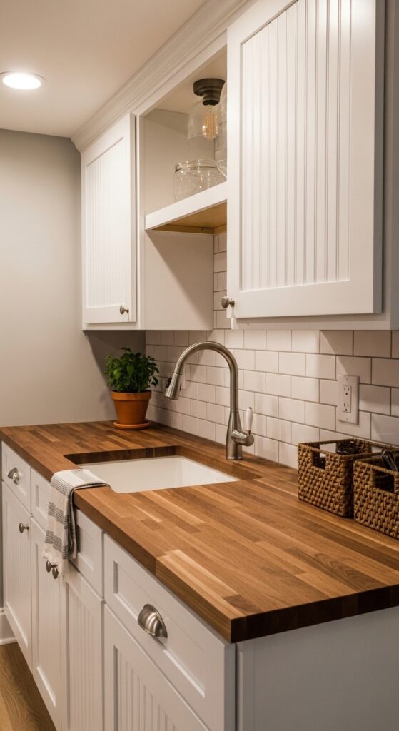 How to achieve it: Source a pre-cut walnut or maple butcher block countertop from IKEA or Home Depot (starting around $150) and seal it with food-safe mineral oil. Pair with classic 3×6 white subway tile in a stacked bond or traditional brick pattern for a backsplash that feels intentional without being trendy.