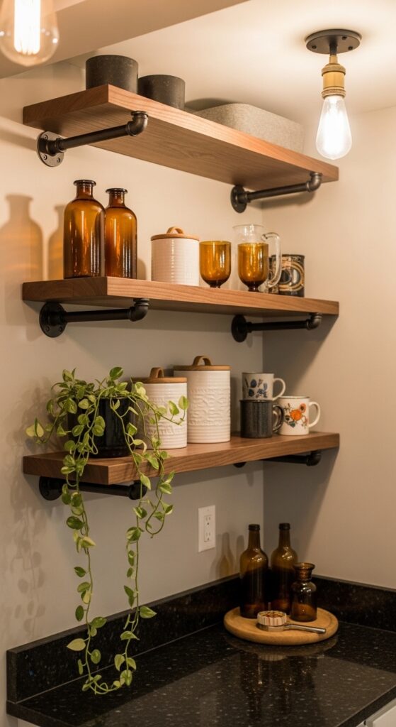 What makes it work: The visual weight of black iron pipe brackets grounds the shelves without bulky upper cabinets that would make a basement feel more closed-in. Styling the shelves with a mix of functional items (mugs, canisters) and decorative ones (trailing plants, amber glass) creates a lived-in, layered look.