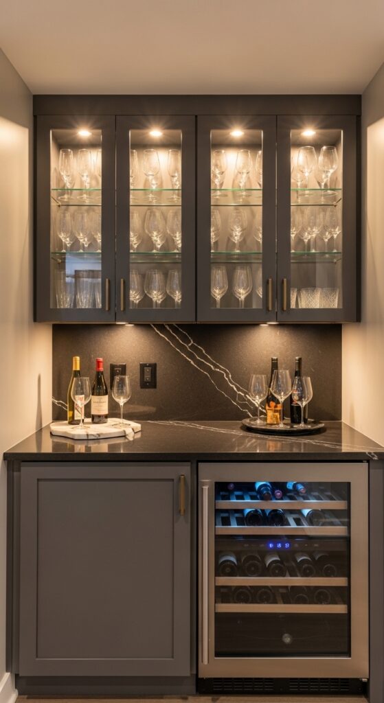 What makes it work: Glass-front cabinets lit from within turn stored glassware into decor — guests see a warm, glowing display rather than closed cabinet doors. The wine fridge integrated flush with the cabinetry creates a built-in look that feels high-end even in a budget-conscious build.