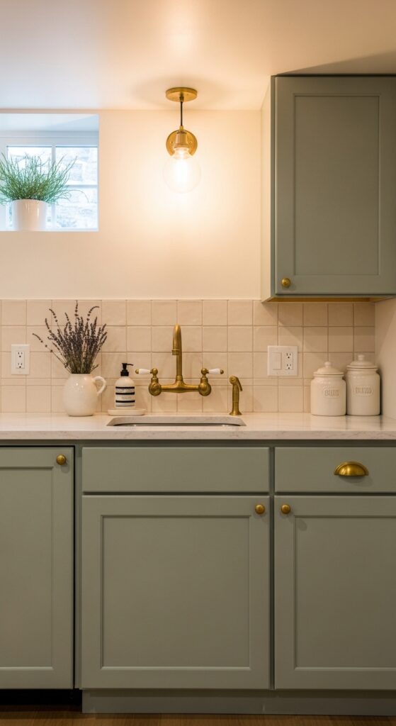 How to achieve it: Paint cabinets with Farrow & Ball “Mizzle,” Benjamin Moore “Rosemary,” or Sherwin-Williams “Privilege Green” — all hit that ideal sage tone. Unlacquered brass hardware from sources like Rejuvenation or Etsy sellers typically runs $8–$25 per pull.