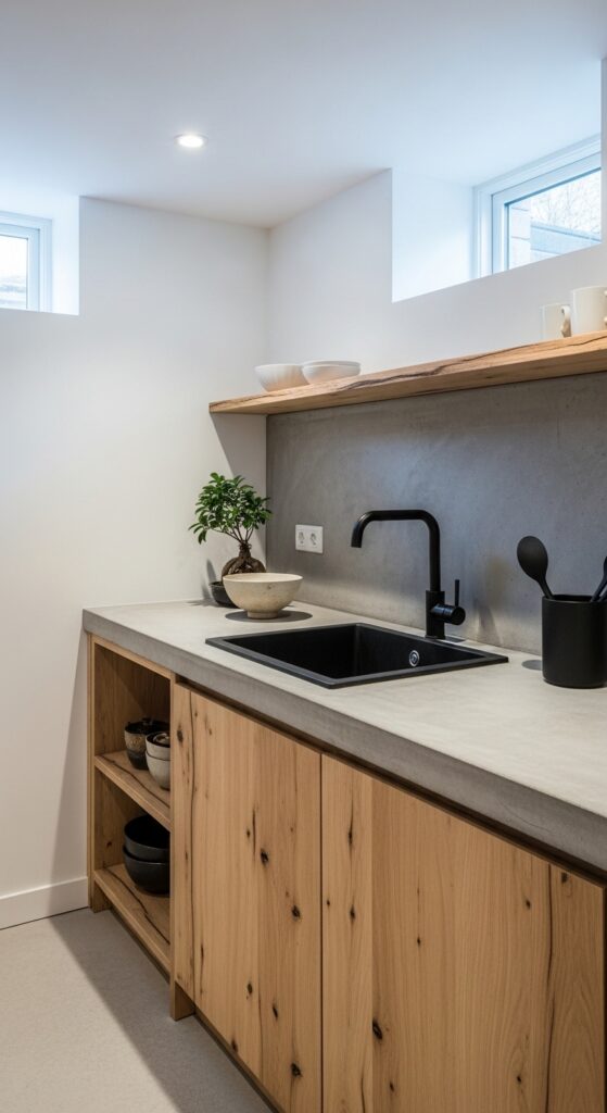 Vibe sentence: Scandi minimalism in a basement kitchenette feels like a deep exhale — simple, intentional, and quietly beautiful.