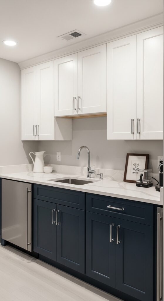 What makes it work: Dark lowers visually anchor the space to the floor — grounding it — while white uppers draw the eye upward and reflect light. This contrast creates the illusion of more vertical space, which is particularly valuable in a basement where ceiling heights may be limited.