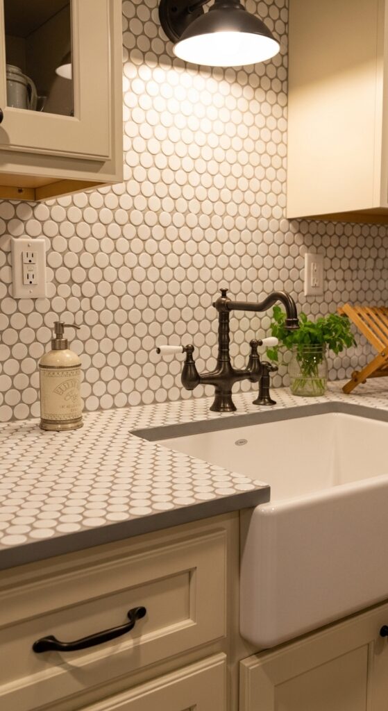 What makes it work: The circular pattern of penny tile creates an almost mosaic-like texture that flat subway tile simply can’t replicate. Dark gray grout (rather than matching white) is the key — it highlights the tile geometry and gives the surface depth and visual weight.