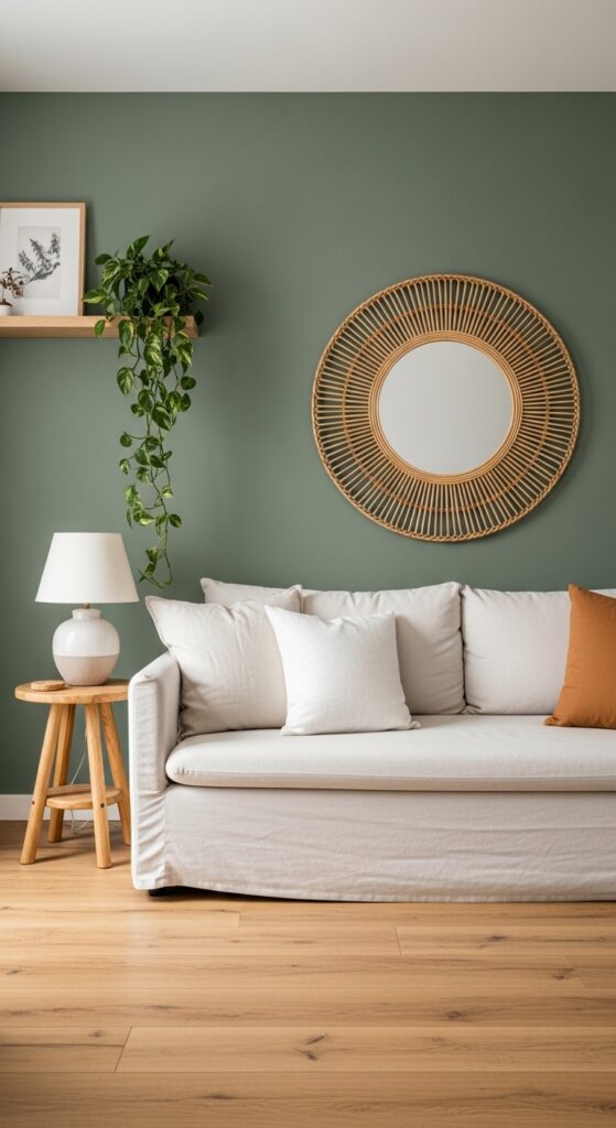 9. Sage Green Accent Wall With Natural Wood