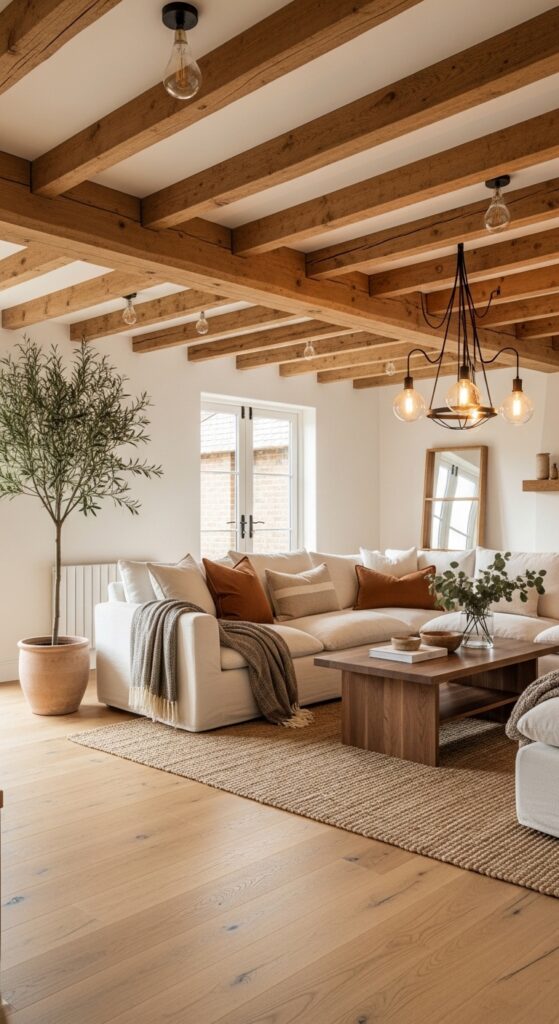 Raw wood ceiling beams anchor the room with warmth and architectural character — effortlessly farmhouse.