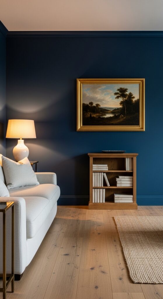 13. Moody Navy Blue and Natural Wood