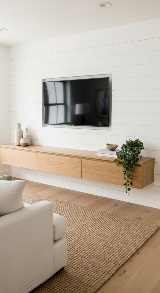 A sleek floating media unit against a shiplap wall blends modern function with farmhouse texture.