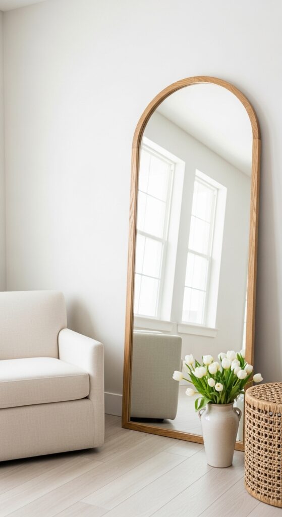 A tall arched floor mirror leaning casually against the wall is effortlessly elegant and spacious-feeling.