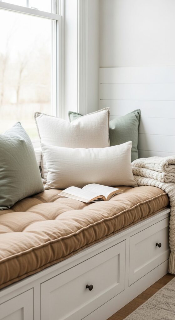 A built-in window seat with linen cushions and storage below — the coziest farmhouse corner imaginable.