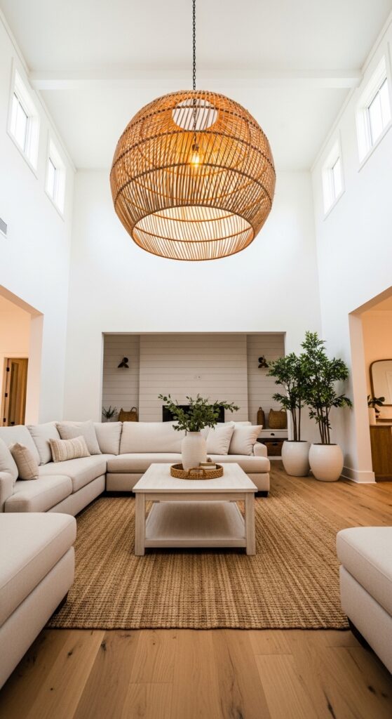 Soaring ceilings with one dramatic oversized rattan pendant light — scale, warmth, and wow factor.