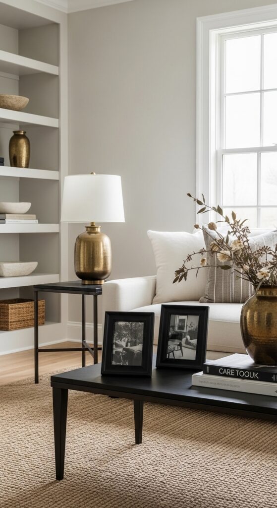 Mixing warm brass and matte black accents throughout the room feels collected, current, and intentional.