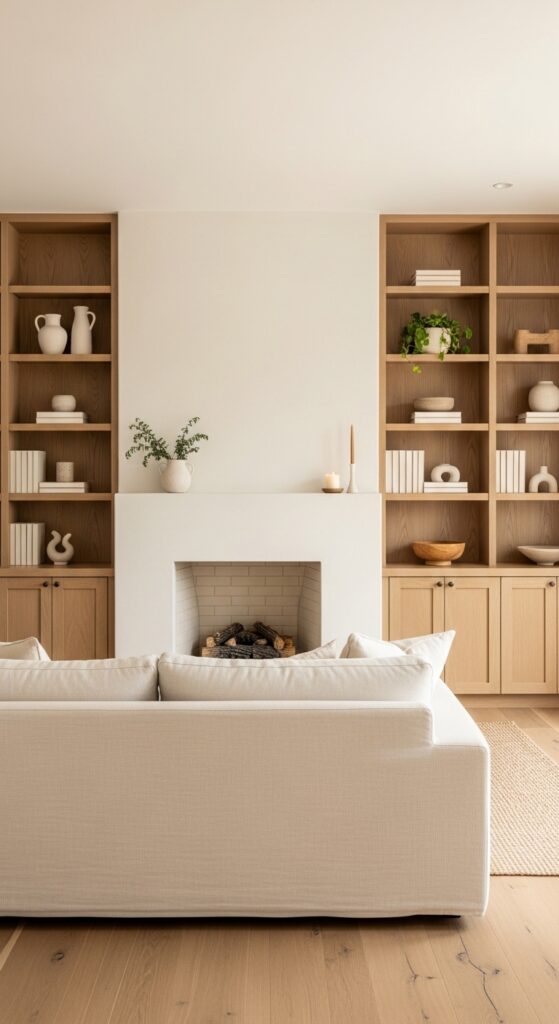 Floor-to-ceiling white oak built-in bookshelves flanking the fireplace — functional, beautiful, and timeless.