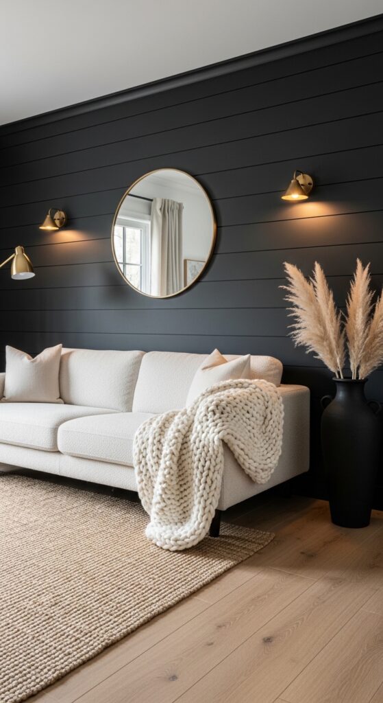 Soft black-painted shiplap as the feature wall — moody, cozy, and strikingly contemporary farmhouse.