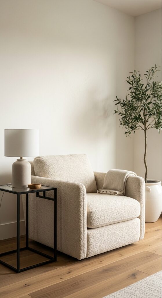 Creamy boucle armchair paired with a matte black steel side table — soft meets structural, perfectly balanced.